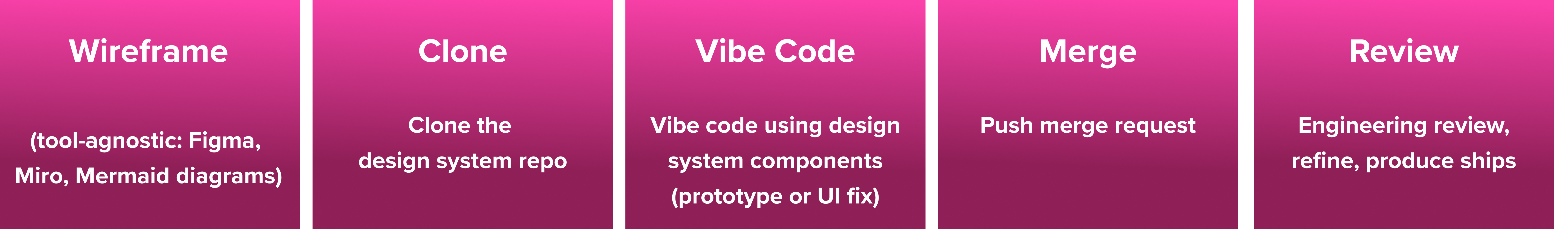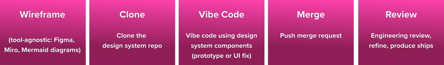 Four months, 40-person organization, four steps. Moving from a design-only tool to vibe-coded prototypes, pushing merge requests, and shipping directly to production.